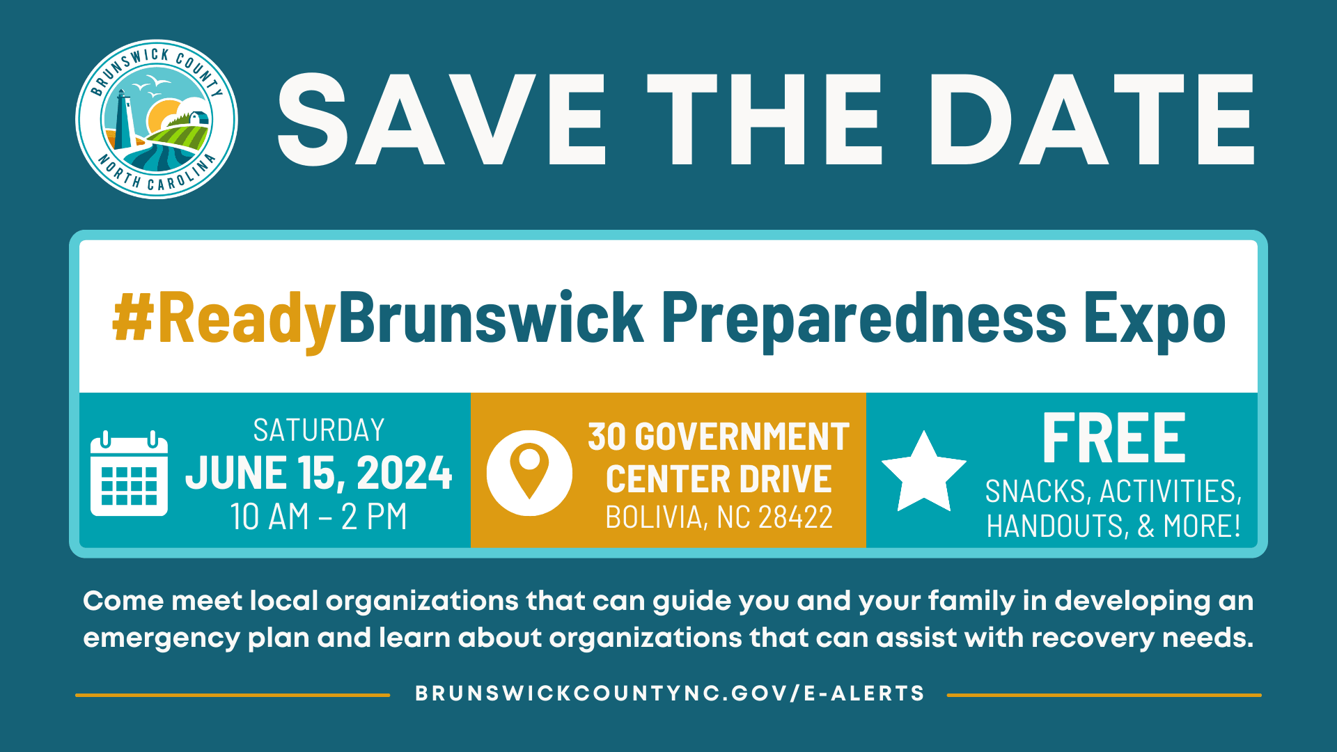 Are you prepared for emergencies? Come by the ReadyBrunswick Preparedness Expo on Saturday, June 15, 2024, anytime between 10 a.m. to 2 p.m. to meet with our team members and other local organizations to learn more about disaster preparedness and recovery in Brunswick County.